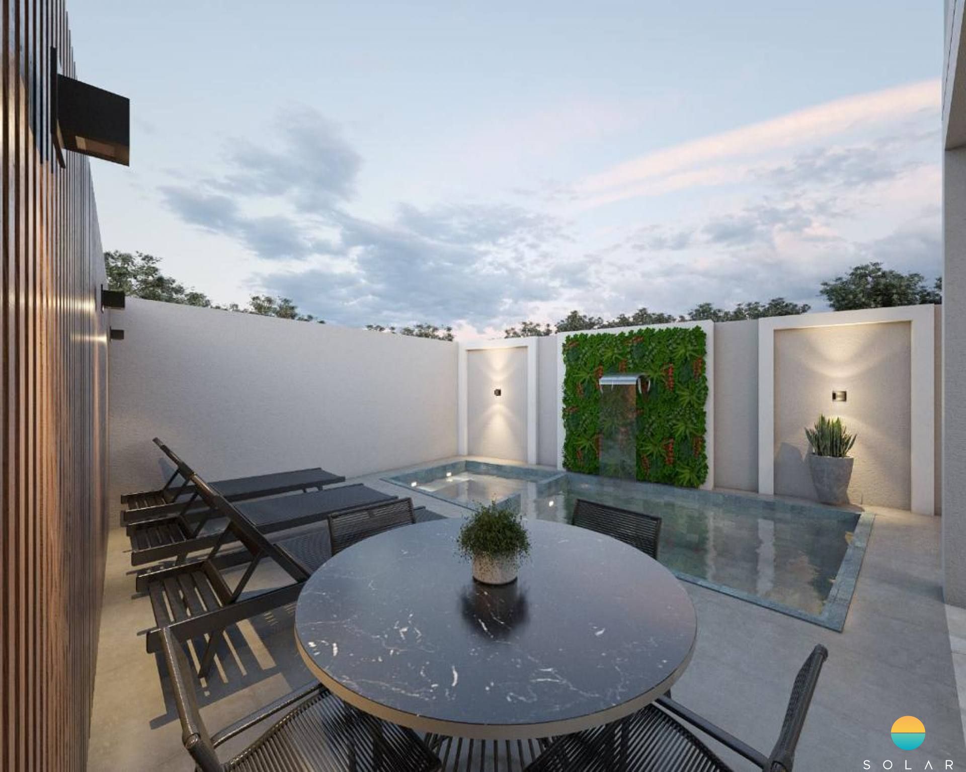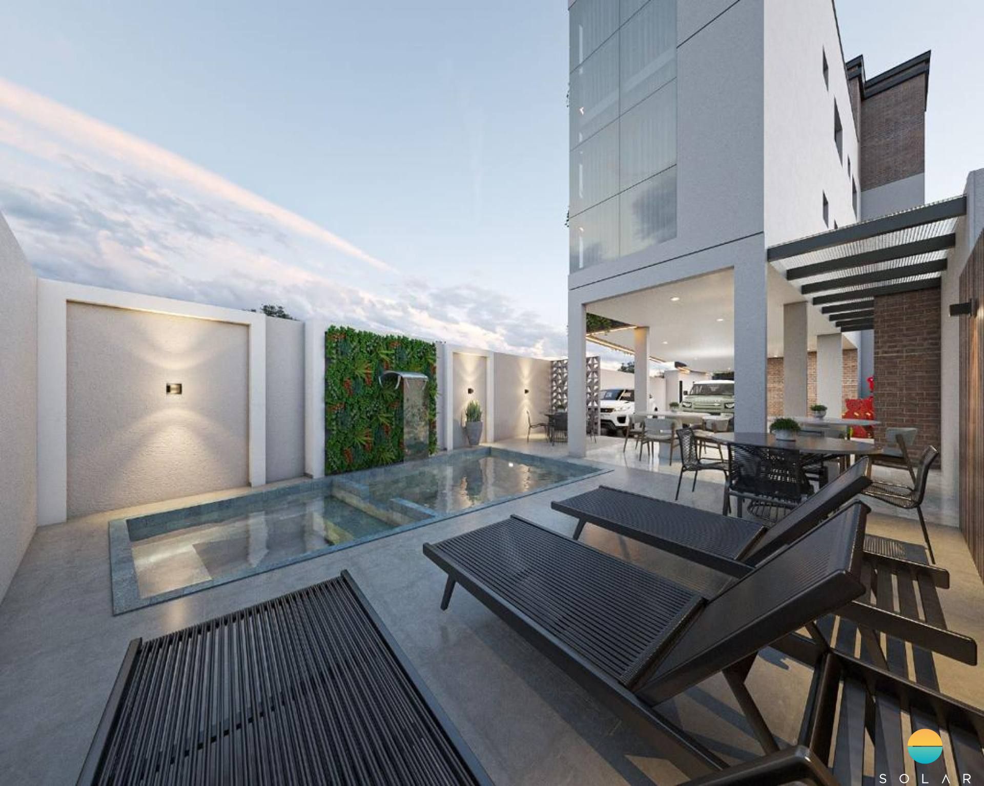 SPA COM HIDROMASSAGEM, CASCATA, ESPAÇO PARA BANHO DE SOL, MESAS, CADEIRAS E